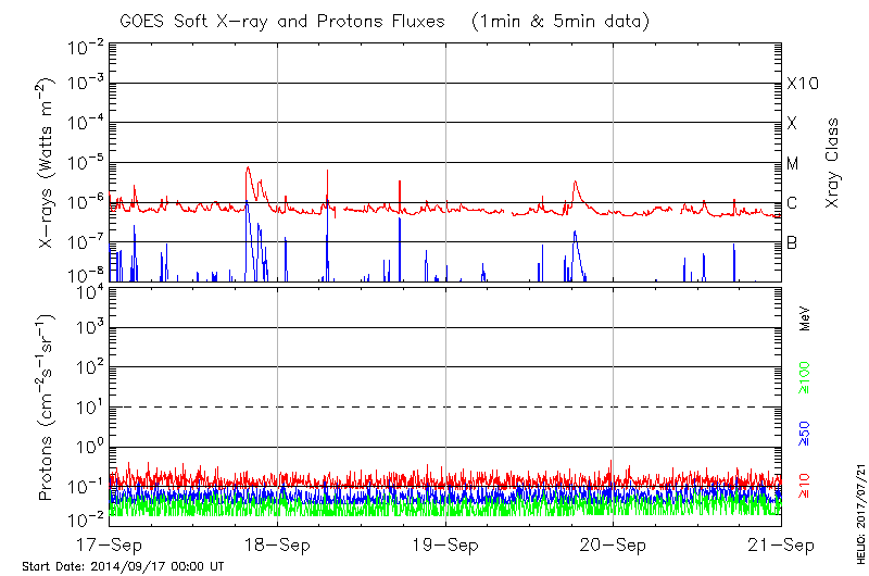 This page provides light-curves generated from GOES soft X-ray and Particle data for the date indicated at the top and the preceding three days.