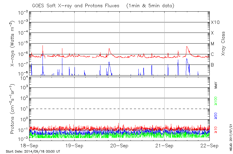 This page provides light-curves generated from GOES soft X-ray and Particle data for the date indicated at the top and the preceding three days.