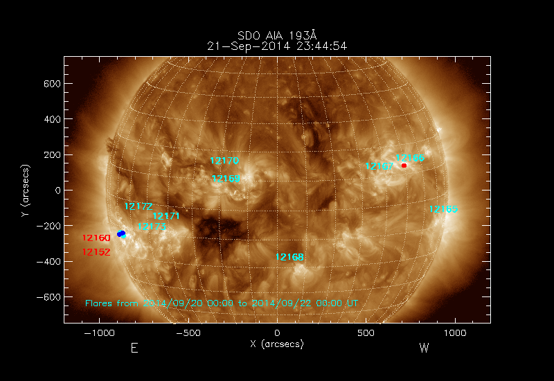 All soft X-ray flares (≥A1.0) where the location has been determined are shown; the flare locations are rotated to the time of the image