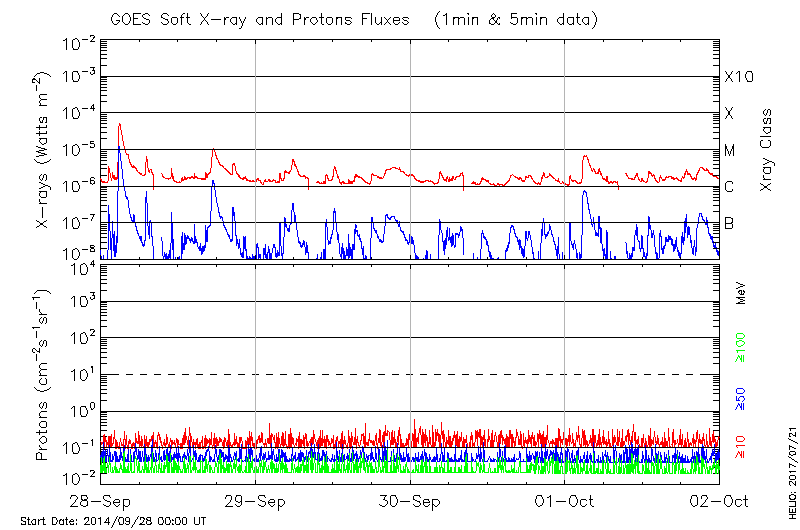 This page provides light-curves generated from GOES soft X-ray and Particle data for the date indicated at the top and the preceding three days.