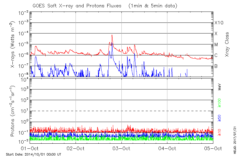 This page provides light-curves generated from GOES soft X-ray and Particle data for the date indicated at the top and the preceding three days.