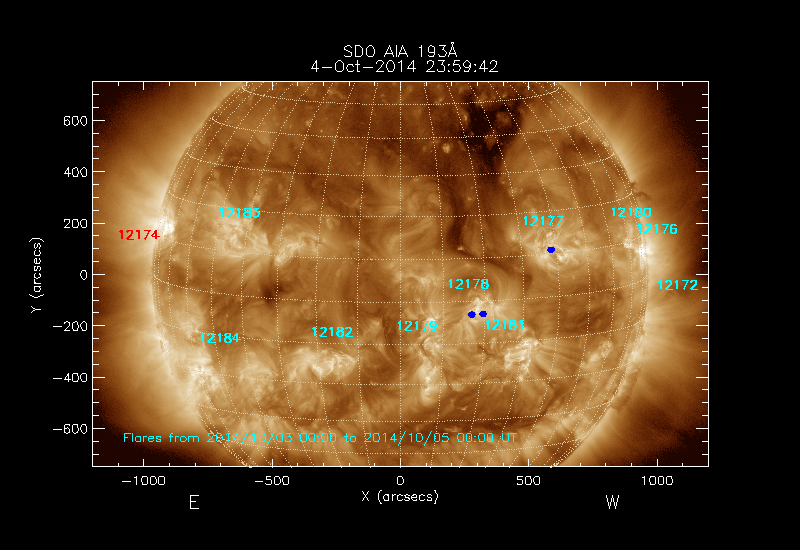 All soft X-ray flares (≥A1.0) where the location has been determined are shown; the flare locations are rotated to the time of the image