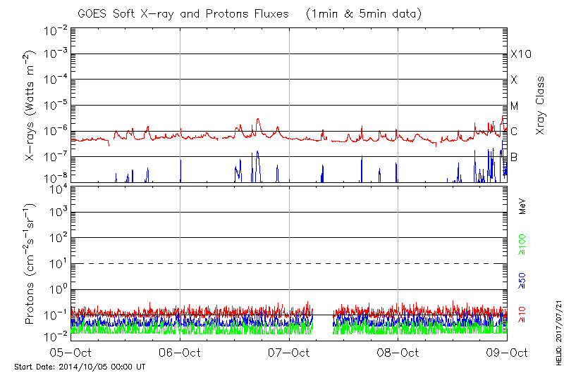 This page provides light-curves generated from GOES soft X-ray and Particle data for the date indicated at the top and the preceding three days.