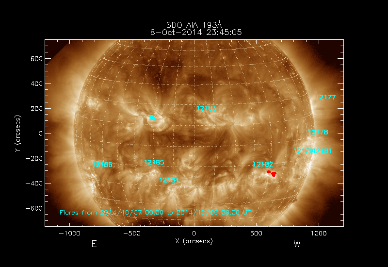 All soft X-ray flares (≥A1.0) where the location has been determined are shown; the flare locations are rotated to the time of the image