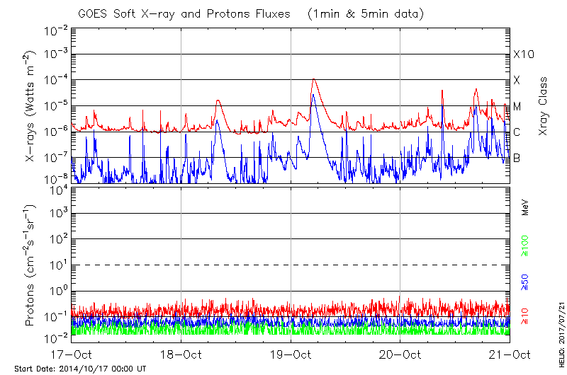 This page provides light-curves generated from GOES soft X-ray and Particle data for the date indicated at the top and the preceding three days.