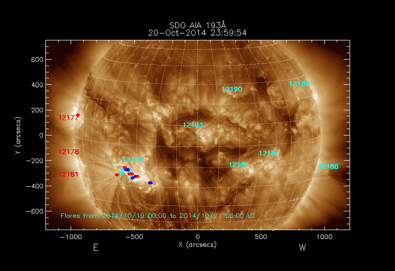 All soft X-ray flares (≥A1.0) where the location has been determined are shown; the flare locations are rotated to the time of the image