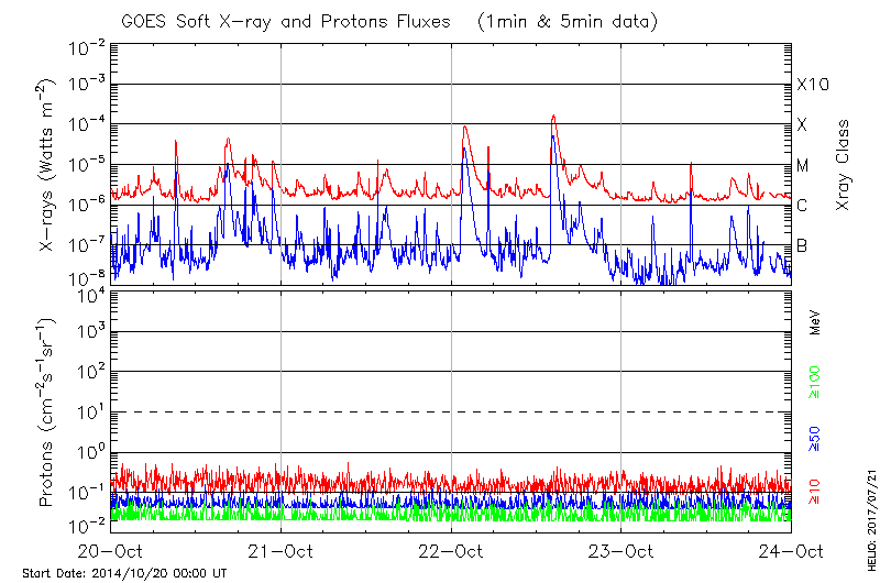 This page provides light-curves generated from GOES soft X-ray and Particle data for the date indicated at the top and the preceding three days.