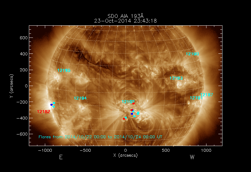 The most recent flares (≤12 hours) are shown as red dots, 12-24 hours ago as blue dots and older ones as turquoise dots.