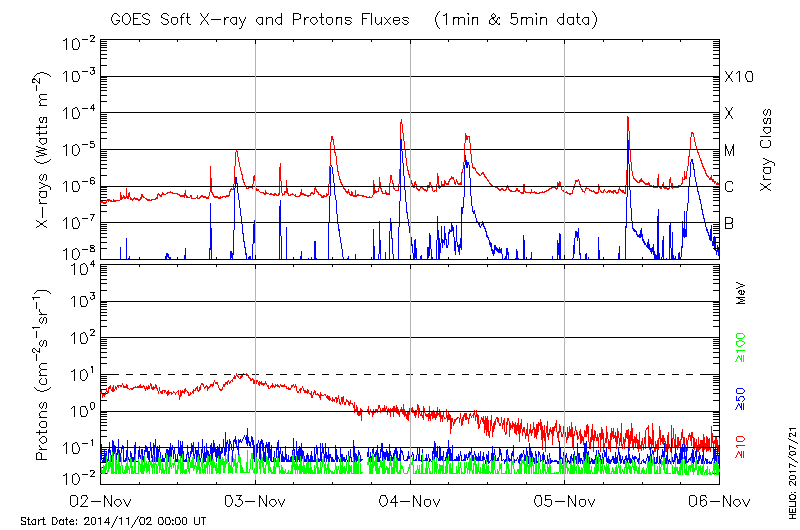 This page provides light-curves generated from GOES soft X-ray and Particle data for the date indicated at the top and the preceding three days.