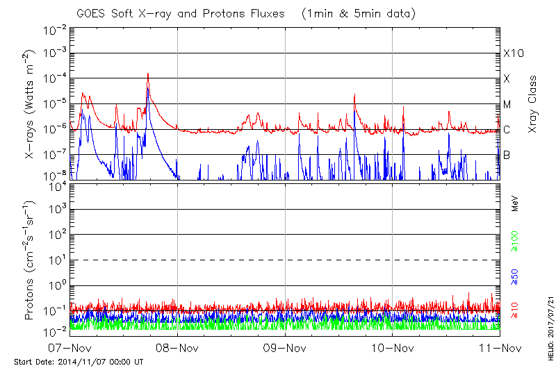 This page provides light-curves generated from GOES soft X-ray and Particle data for the date indicated at the top and the preceding three days.