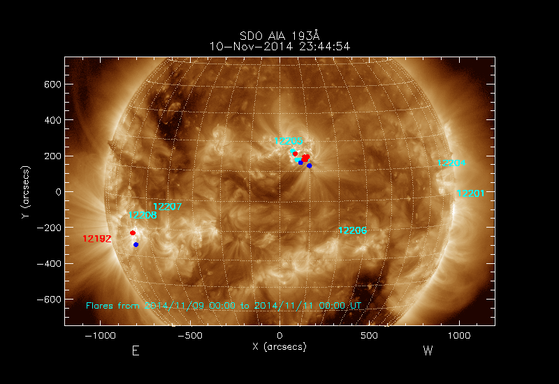 All soft X-ray flares (≥A1.0) where the location has been determined are shown; the flare locations are rotated to the time of the image