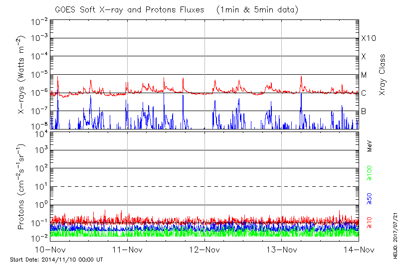 This page provides light-curves generated from GOES soft X-ray and Particle data for the date indicated at the top and the preceding three days.