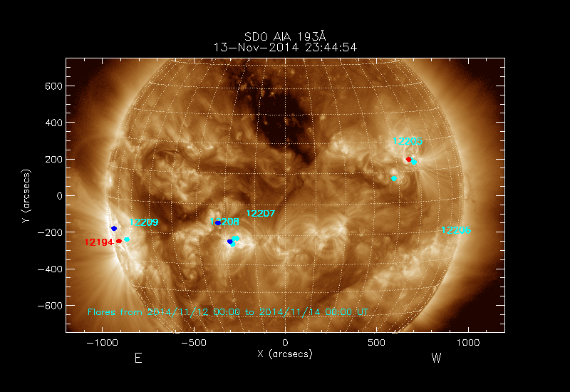 All soft X-ray flares (≥A1.0) where the location has been determined are shown; the flare locations are rotated to the time of the image