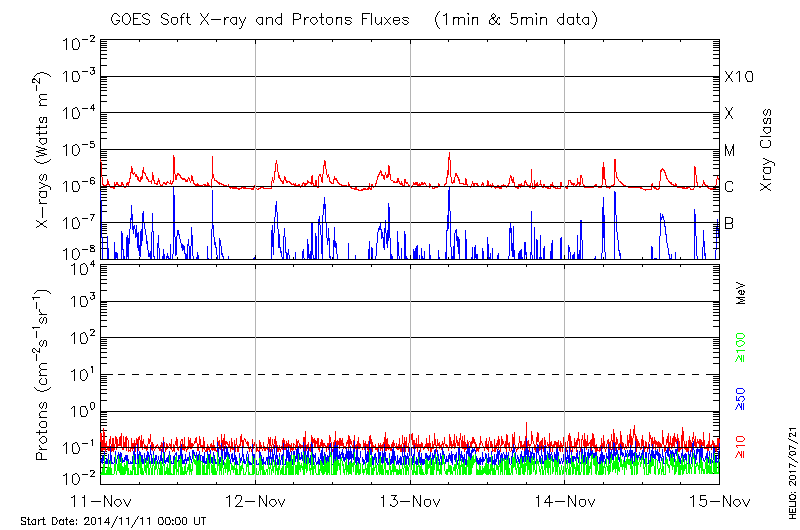 This page provides light-curves generated from GOES soft X-ray and Particle data for the date indicated at the top and the preceding three days.
