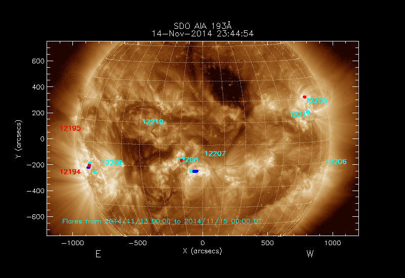 The most recent flares (≤12 hours) are shown as red dots, 12-24 hours ago as blue dots and older ones as turquoise dots.