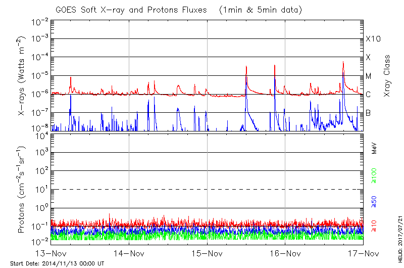 This page provides light-curves generated from GOES soft X-ray and Particle data for the date indicated at the top and the preceding three days.