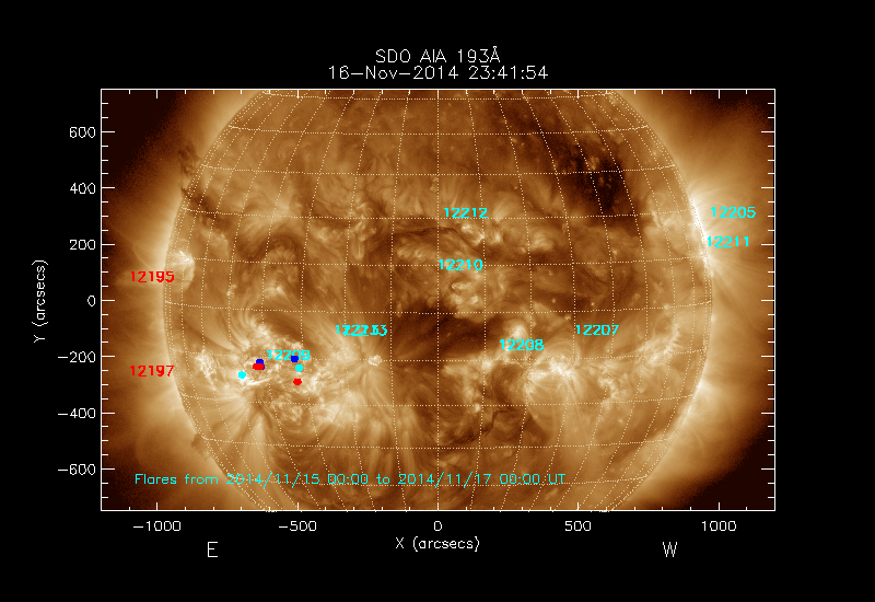 The most recent flares (≤12 hours) are shown as red dots, 12-24 hours ago as blue dots and older ones as turquoise dots.