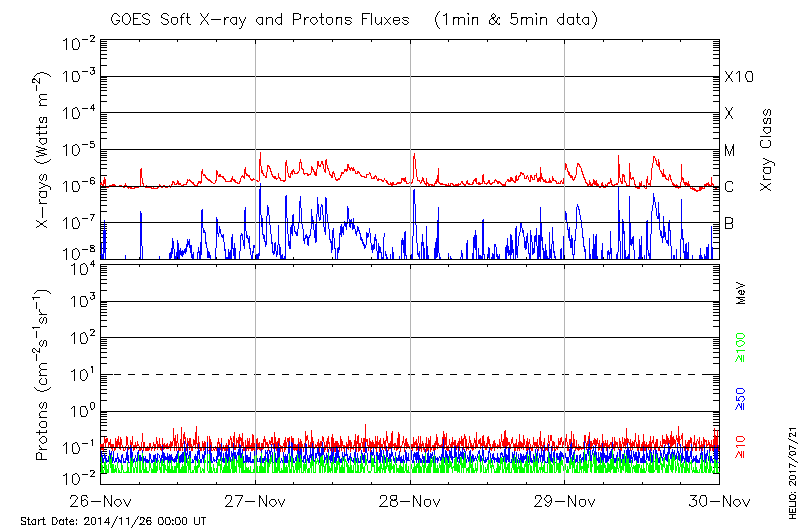 This page provides light-curves generated from GOES soft X-ray and Particle data for the date indicated at the top and the preceding three days.