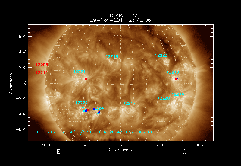 The most recent flares (≤12 hours) are shown as red dots, 12-24 hours ago as blue dots and older ones as turquoise dots.