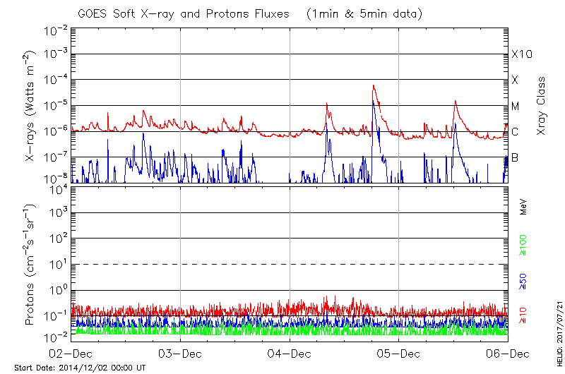 This page provides light-curves generated from GOES soft X-ray and Particle data for the date indicated at the top and the preceding three days.