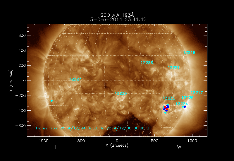 All soft X-ray flares (≥A1.0) where the location has been determined are shown; the flare locations are rotated to the time of the image