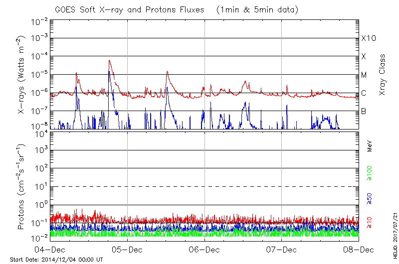 This page provides light-curves generated from GOES soft X-ray and Particle data for the date indicated at the top and the preceding three days.
