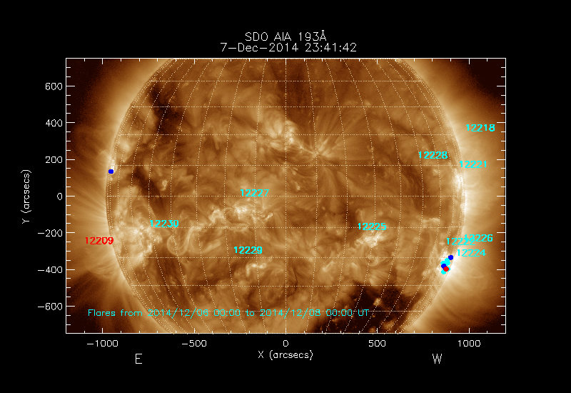 All soft X-ray flares (≥A1.0) where the location has been determined are shown; the flare locations are rotated to the time of the image
