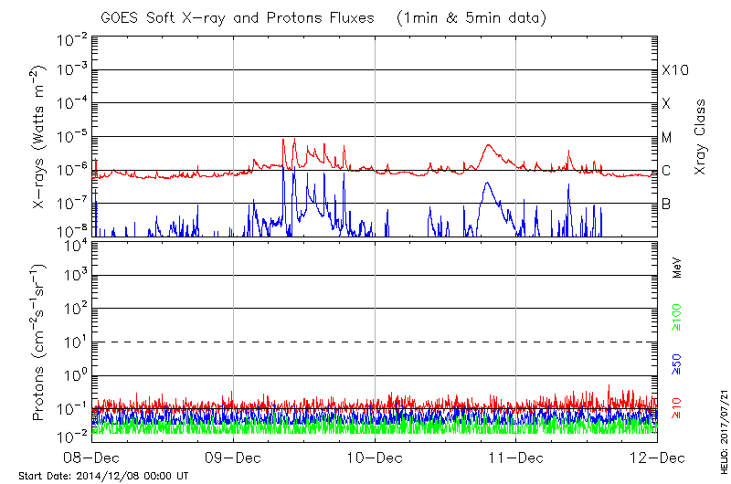 This page provides light-curves generated from GOES soft X-ray and Particle data for the date indicated at the top and the preceding three days.
