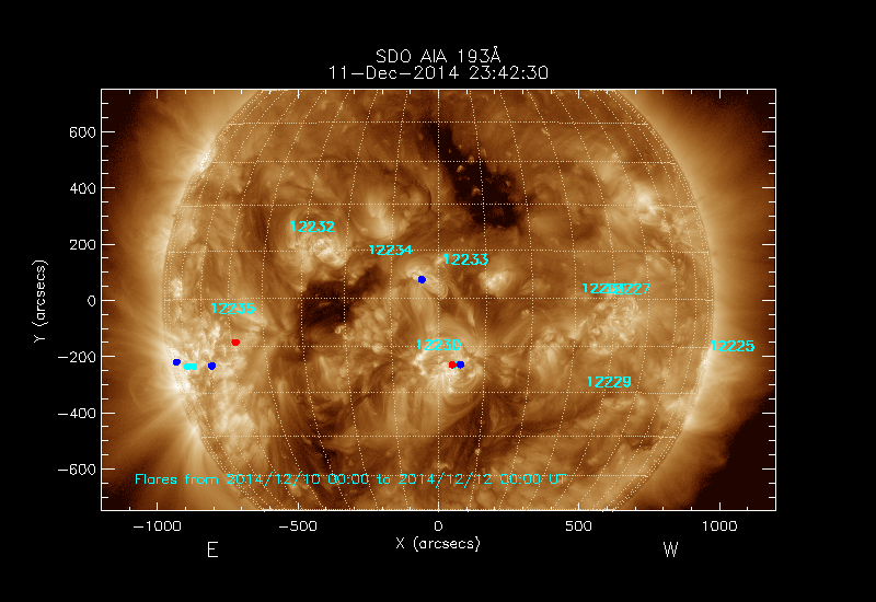 The most recent flares (≤12 hours) are shown as red dots, 12-24 hours as blue