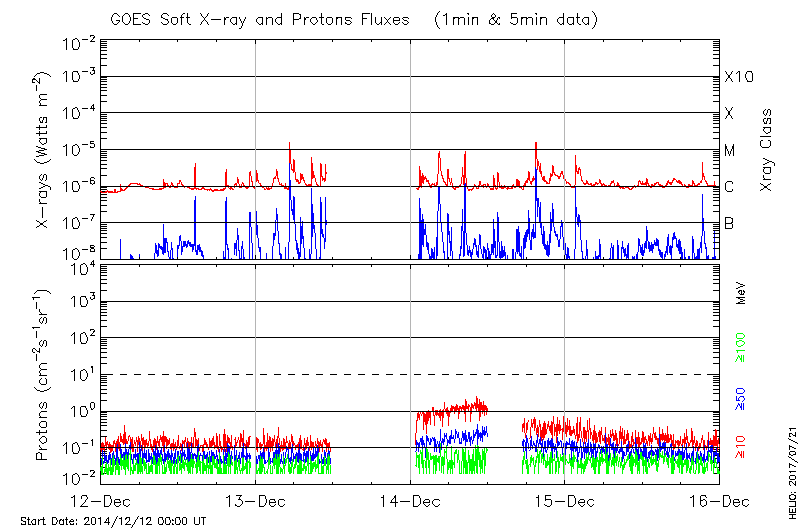 This page provides light-curves generated from GOES soft X-ray and Particle data for the date indicated at the top and the preceding three days.