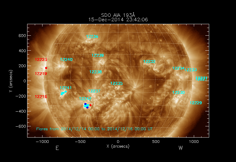The most recent flares (≤12 hours) are shown as red dots, 12-24 hours ago as blue dots and older ones as turquoise dots.