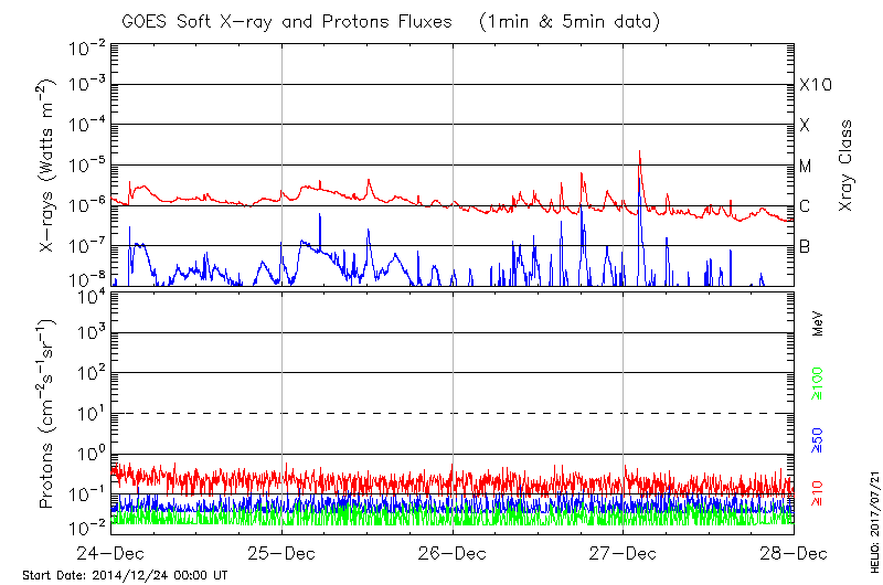 This page provides light-curves generated from GOES soft X-ray and Particle data for the date indicated at the top and the preceding three days.