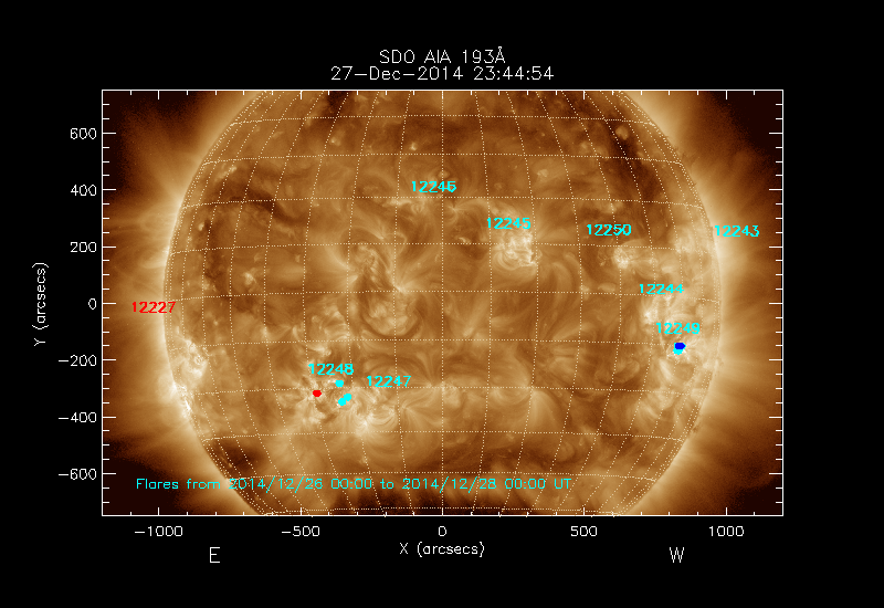 The most recent flares (≤12 hours) are shown as red dots, 12-24 hours ago as blue dots and older ones as turquoise dots.
