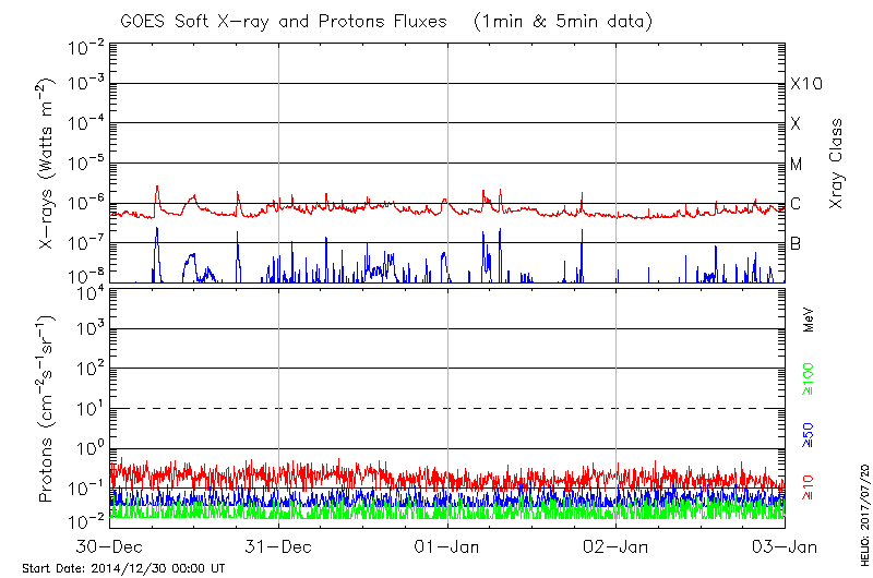 This page provides light-curves generated from GOES soft X-ray and Particle data for the date indicated at the top and the preceding three days.