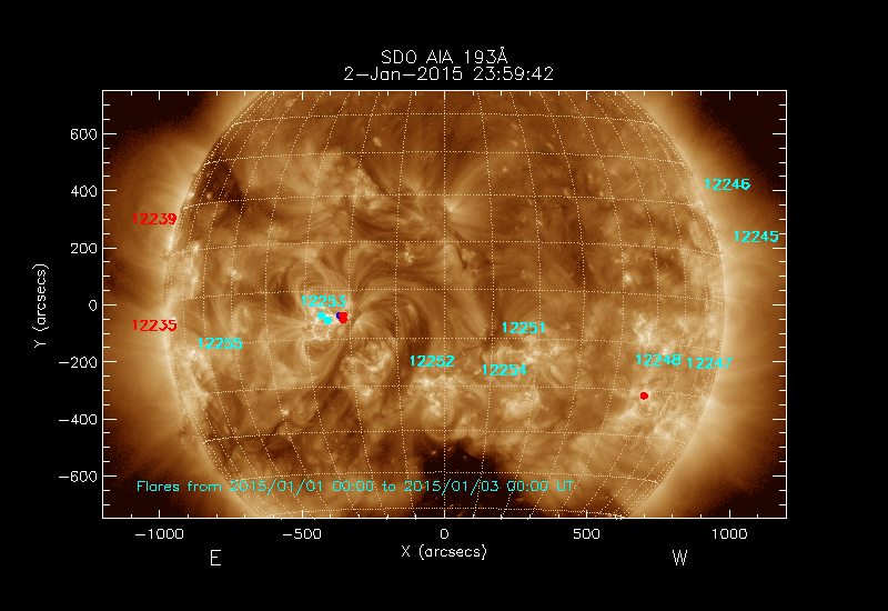 The locations of the flares over-plotted on the image are derived from the flare catalogue