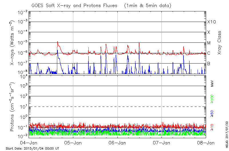 This page provides light-curves generated from GOES soft X-ray and Particle data for the date indicated at the top and the preceding three days.