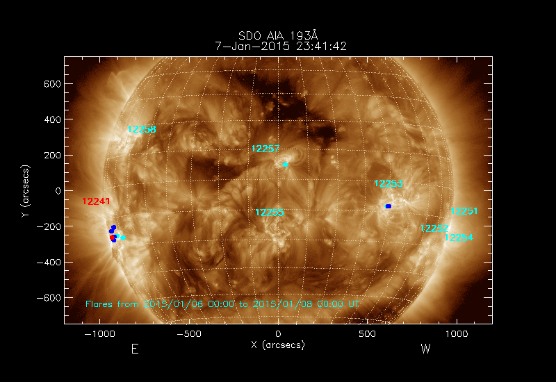 All soft X-ray flares (≥A1.0) where the location has been determined are shown; the flare locations are rotated to the time of the image