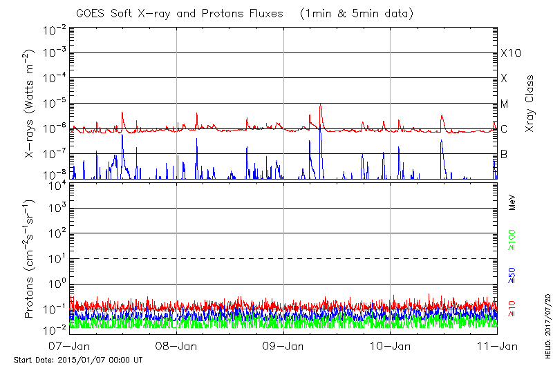 This page provides light-curves generated from GOES soft X-ray and Particle data for the date indicated at the top and the preceding three days.
