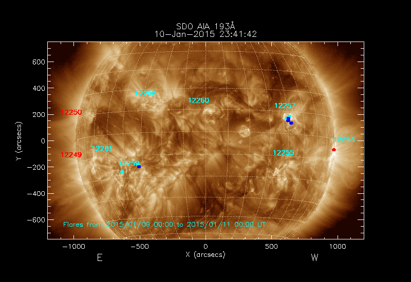 All soft X-ray flares (≥A1.0) where the location has been determined are shown; the flare locations are rotated to the time of the image