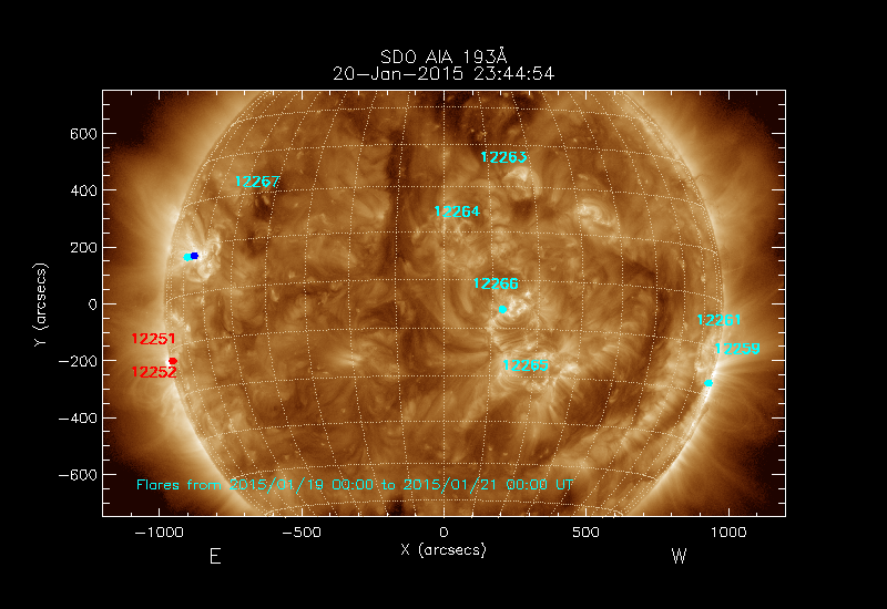 All soft X-ray flares (≥A1.0) where the location has been determined are shown; the flare locations are rotated to the time of the image