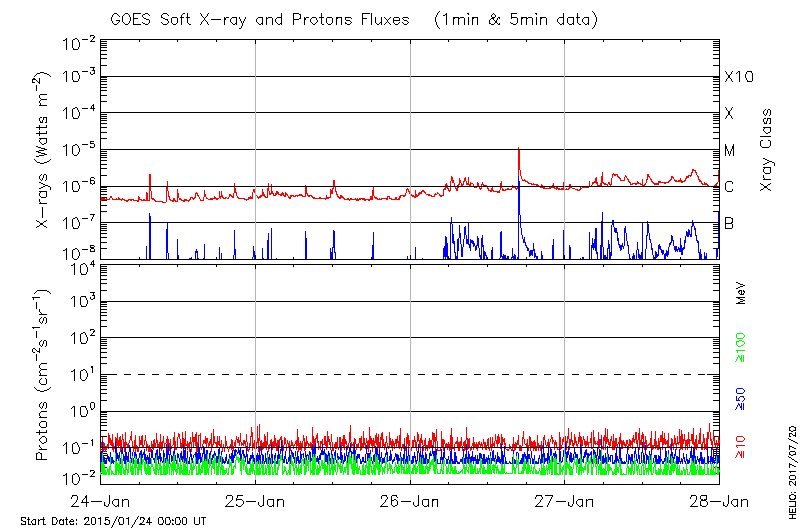 This page provides light-curves generated from GOES soft X-ray and Particle data for the date indicated at the top and the preceding three days.