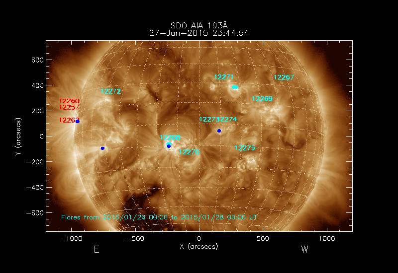 All soft X-ray flares (≥A1.0) where the location has been determined are shown; the flare locations are rotated to the time of the image
