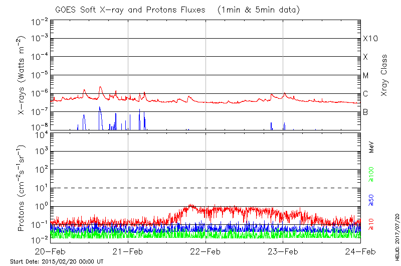 This page provides light-curves generated from GOES soft X-ray and Particle data for the date indicated at the top and the preceding three days.