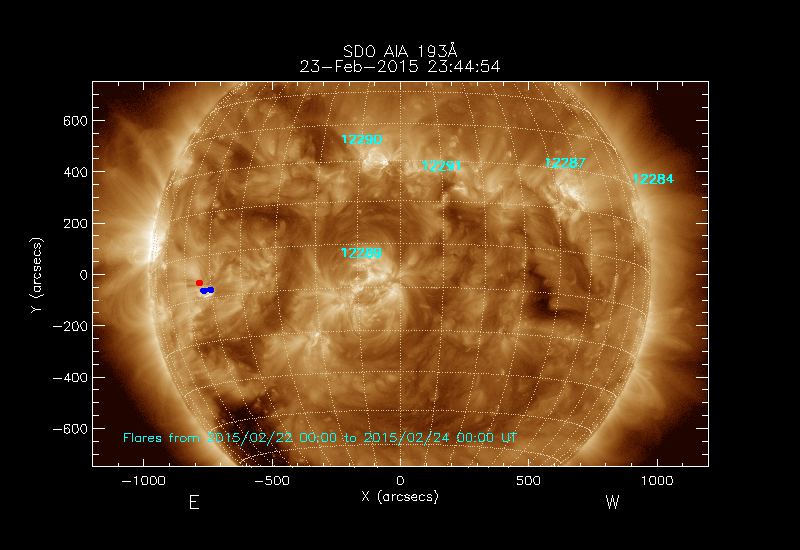 The most recent flares (≤12 hours) are shown as red dots, 12-24 hours ago as blue dots and older ones as turquoise dots.
