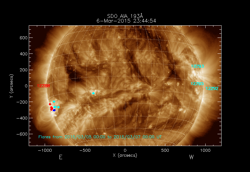The most recent flares (≤12 hours) are shown as red dots, 12-24 hours ago as blue dots and older ones as turquoise dots.