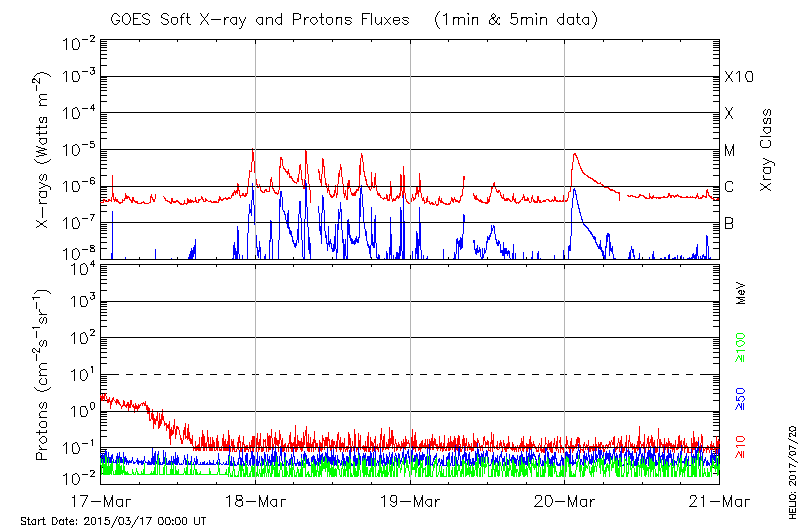 This page provides light-curves generated from GOES soft X-ray and Particle data for the date indicated at the top and the preceding three days.
