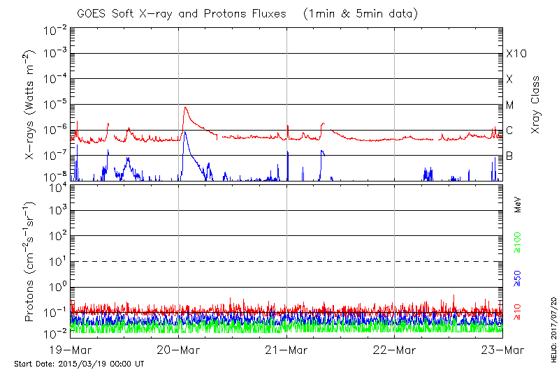 This page provides light-curves generated from GOES soft X-ray and Particle data for the date indicated at the top and the preceding three days.