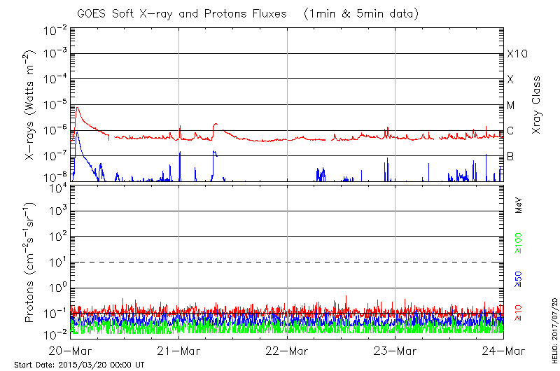 This page provides light-curves generated from GOES soft X-ray and Particle data for the date indicated at the top and the preceding three days.