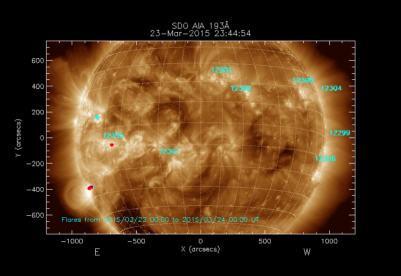The most recent flares (≤12 hours) are shown as red dots, 12-24 hours ago as blue dots and older ones as turquoise dots.