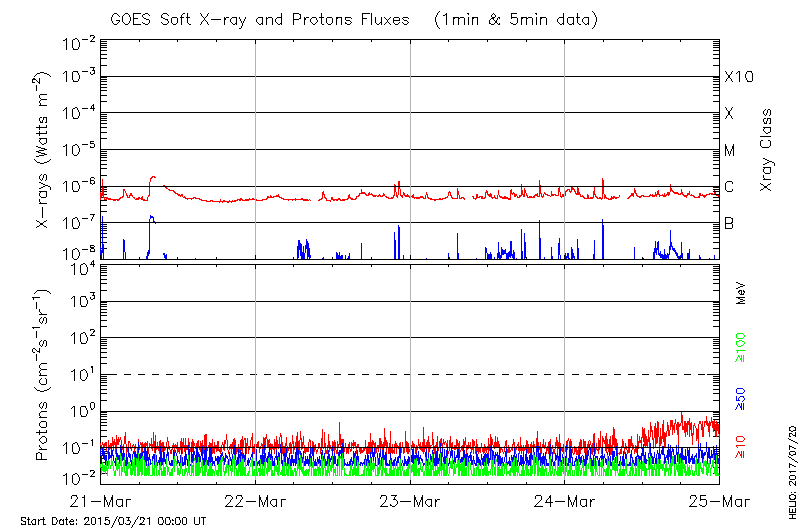 This page provides light-curves generated from GOES soft X-ray and Particle data for the date indicated at the top and the preceding three days.